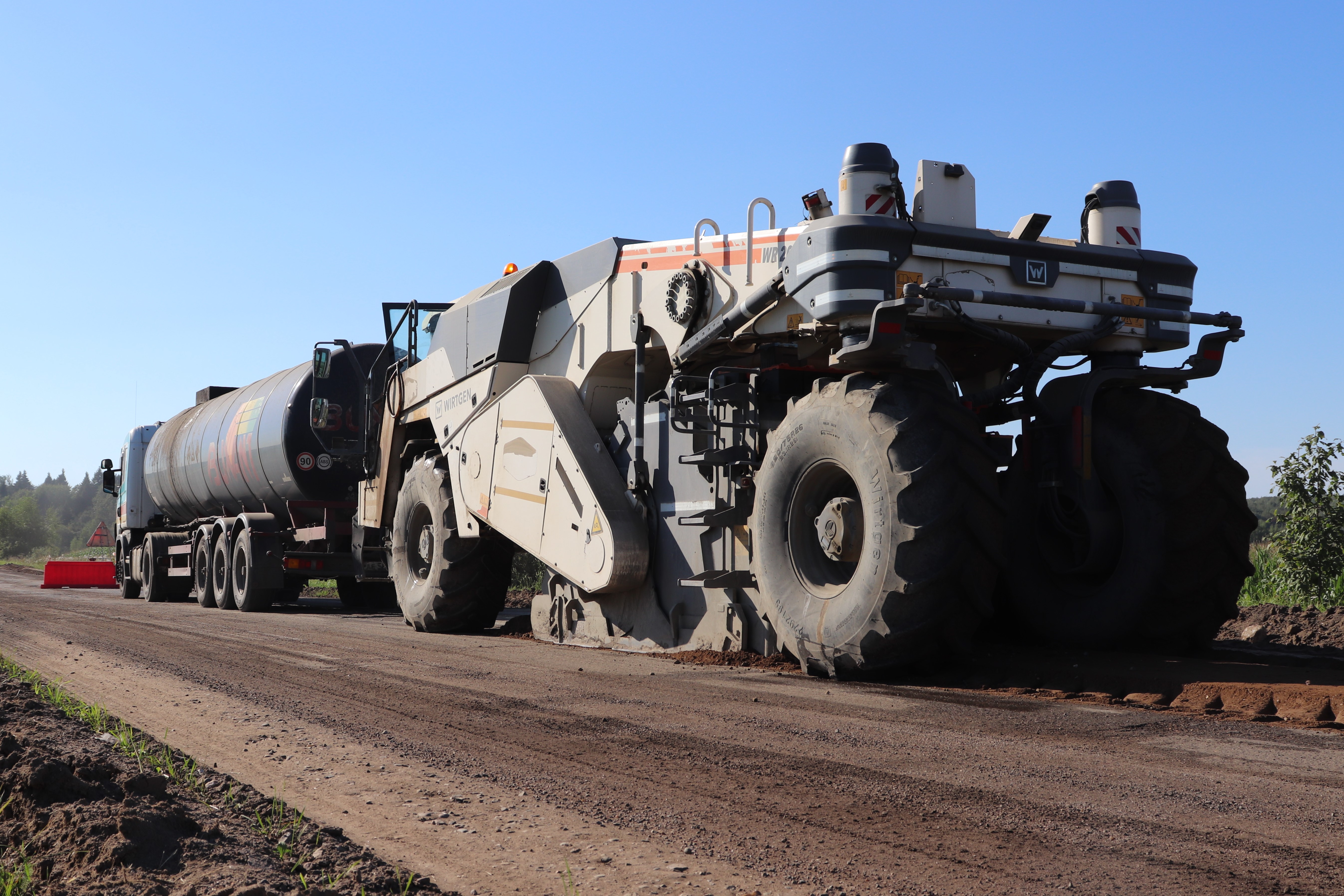 Подрядная организация на объекте выполняет фрезерование изношенного асфальтобетонного покрытия и работы по усилению дорожного основания с применением специальной техники — ресайклера. Слой основания, полученный после ресайклинга, получается достаточно прочным и позволяет увеличить несущую способность покрытия для проезда крупногабаритного и сельскохозяйственного транспорта. Затем на полученное основание будет уложено два слоя асфальта с применением стыковочной битумной ленты.